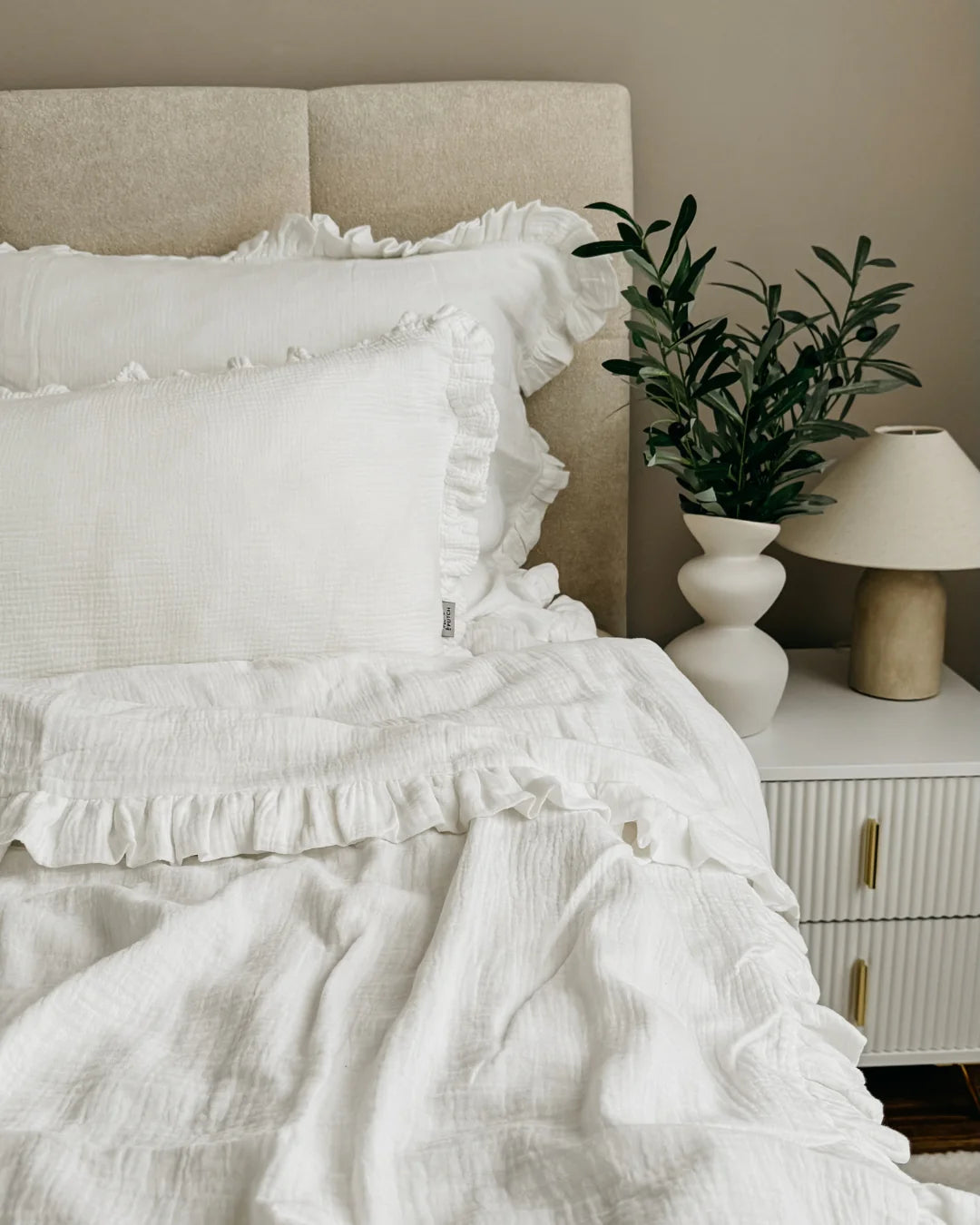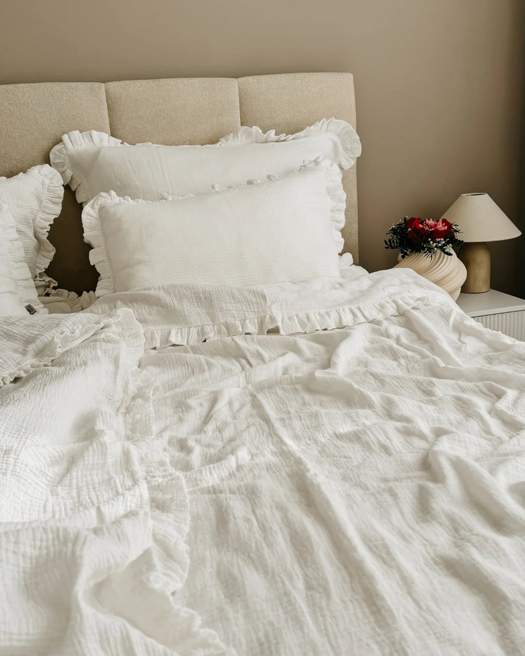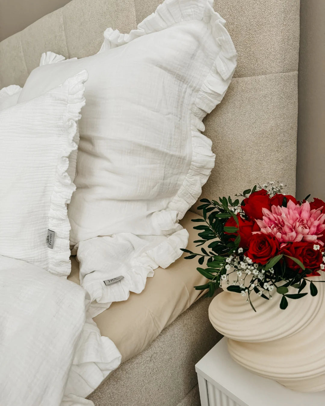 Ein Hauch Romantik, 100% Bio-Komfort: Unsere Musselin Rüschenbettwäsche aus feinster Bio-Baumwolle ist weich, atmungsaktiv und temperaturausgleichend – für traumhafte Nächte das ganze Jahr über. Die zarten Rüschen bringen verspielten Charme in dein Schlafzimmer und machen sie zur cozy Alternative zur klassischen Bettwäsche. Warum du sie lieben wirst: 100% Bio-Musselin-Baumwolle – weich, nachhaltig & hautfreundlich Fair produziert in Polen – mit Liebe & Verantwortung gefertigt Atmungsaktiv & temperaturausgleichend – für alle Jahreszeiten Romantischer Rüschen-Look – für ein verträumtes Schlafzimmer-Upgrade Wolkenweiches Gefühl – ideal zum Einkuscheln & Ausschlafen