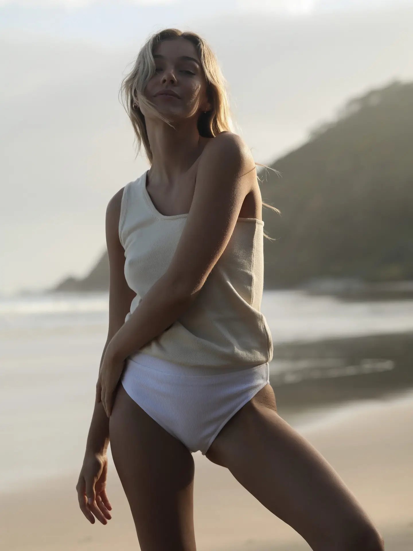 Dieses Design feiert die natürliche Schönheit von soften Stoffen in einem zarten, cleanen Ton – perfekt für heiße Sommertage. Der sinnliche One-Shoulder-Knit ist ein easy Basic, das sich wie eine zweite Haut anfühlt. Leicht, lässig, ein Hauch von „du selbst“. Ein Piece, das dich so zeigt, wie du bist – raw, real, radiant.