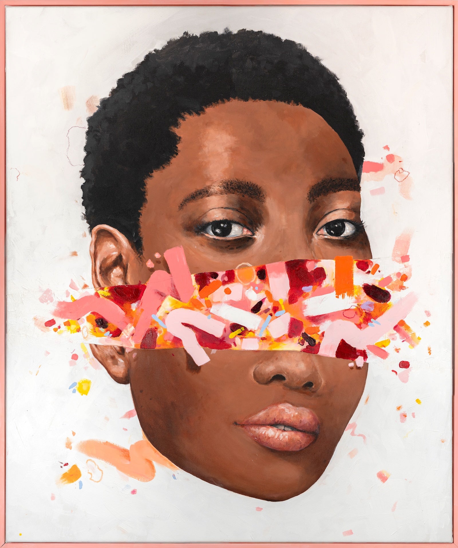 "Jola" zeigt, wie durch Zerstörung Neues entsteht: Der gemalte Kopf wurde zerschnitten, verschoben und mit Farben sowie abstrakten Formen übermalt – ein Neuanfang als Farbexplosion.