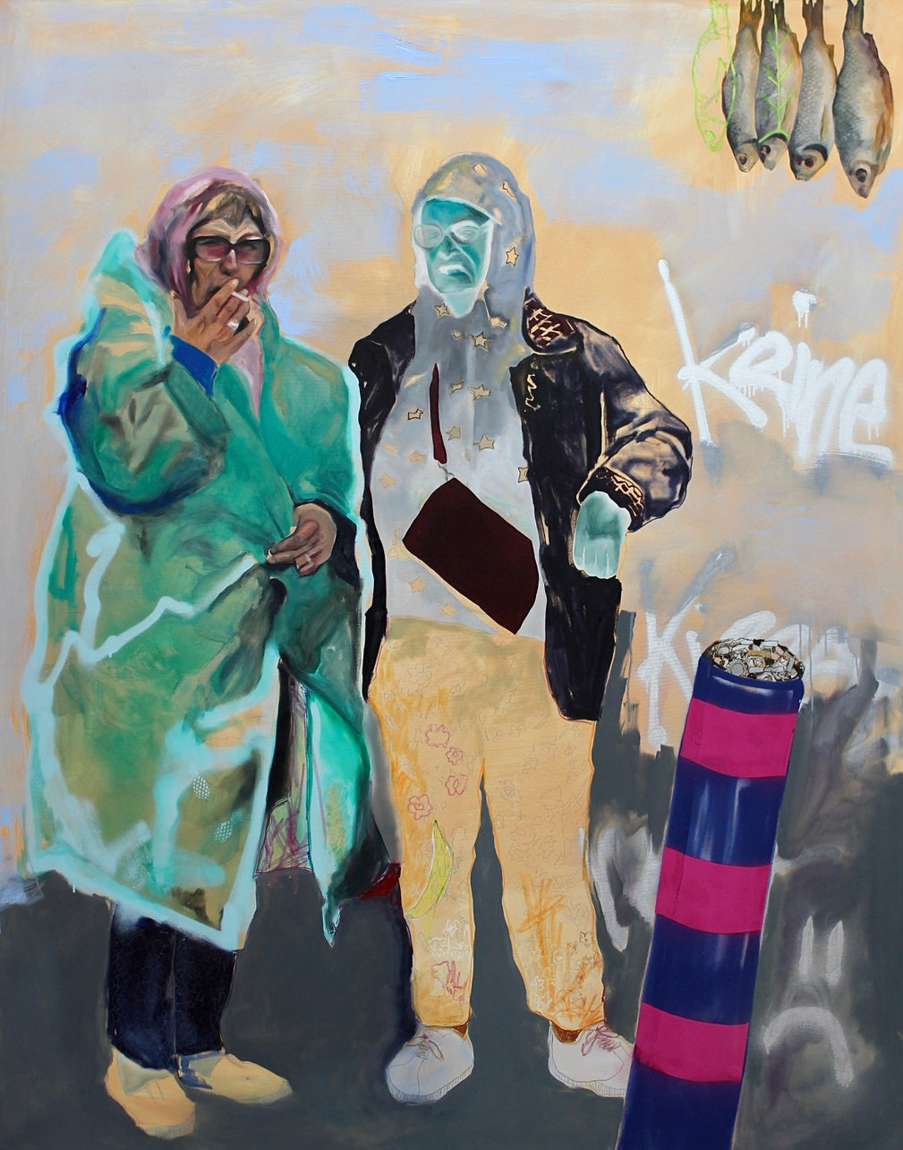 „THE CITY BELONGS TO US“ 2024 Dieses Werk entstand aus Eindrücken des urbanen Raums. Zwei Frauen nehmen darin selbstbewusst und präsent ihren Platz in der Stadt ein – unabhängig von Alter oder sozialem Status. Die Szene setzt sich mit Fragen nach Sichtbarkeit und Zugehörigkeit auseinander. Das Werk basiert auf meiner persönlichen Wahrnehmung des Alltags und kombiniert konkrete und abstrakte Elemente zu einem vielschichtigen Bild des Großstadtlebens.