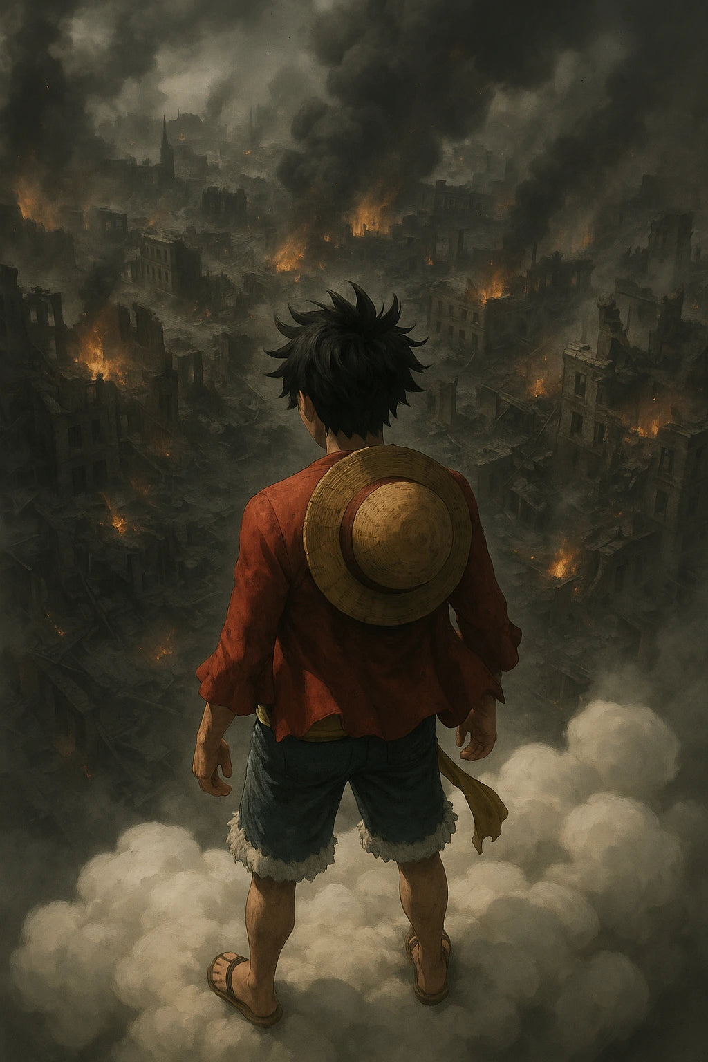 Ruffy steht über den Ruinen der Welt. Flammen lodern, Rauch steigt auf – doch auf seiner Wolke bleibt er ruhig. Ein Held zwischen Untergang und Hoffnung