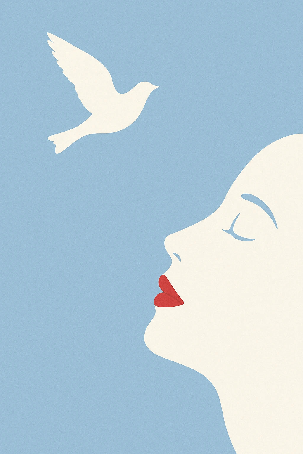 Reduzierte Formen erzählen große Gefühle: Eine Frau, ein Vogel, ein Himmel. Der Moment, in dem Gedanken losfliegen – zart, leise, entschlossen