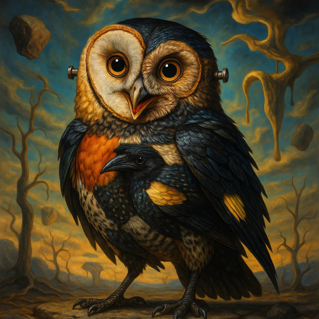 Ein Zwitterwesen aus Eule und Krähe, verschraubt, fremd und vertraut. Es blickt aus einer Welt, in der alles möglich scheint – außer Vergessen