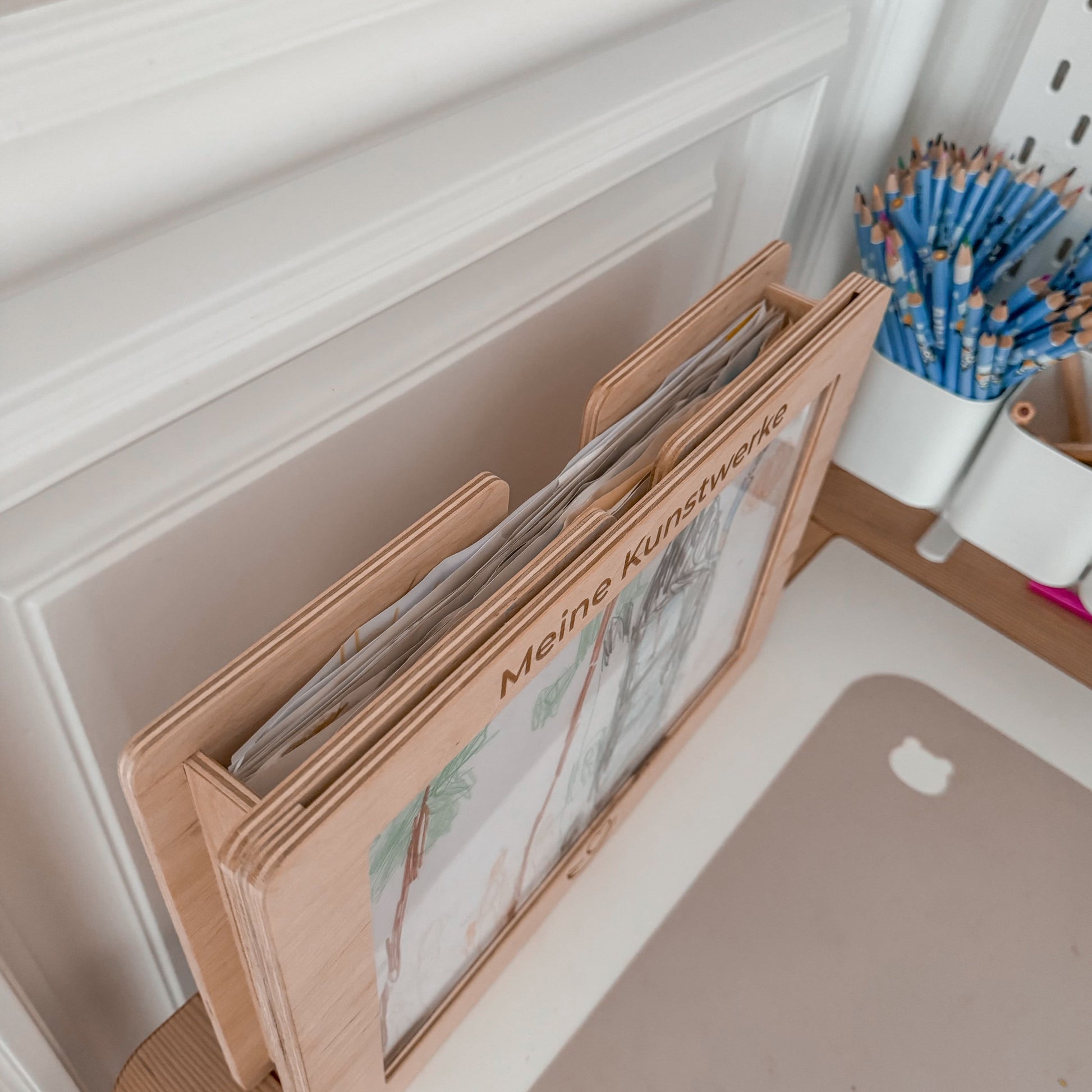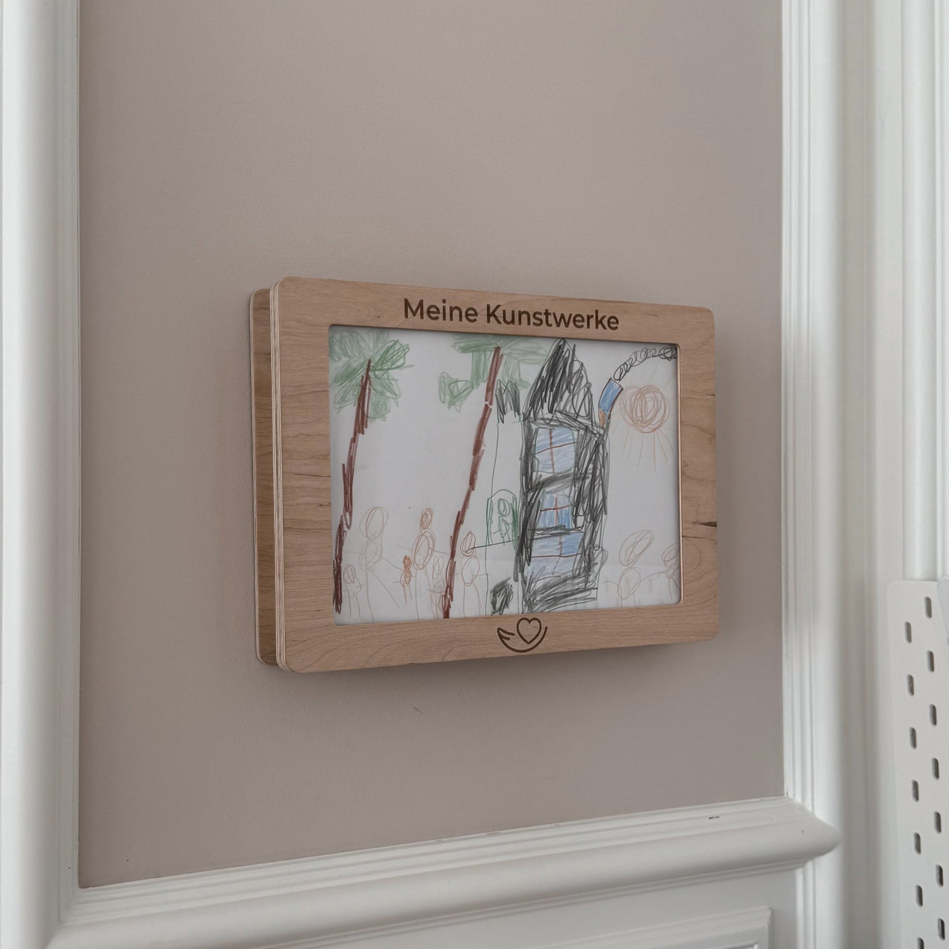 Er kann problemlos an der Wand montiert oder auf einem Tisch platziert werden und ermöglicht ein einfaches Austauschen der Bilder. Neben dem Hauptbild (vorne) bietet er großzügigen Platz für eine Sammlung weiterer Kunstwerke im Fach dahinter. So kann die Entwicklung des Kindes festgehalten und gleichzeitig das Zuhause verschönert werden!