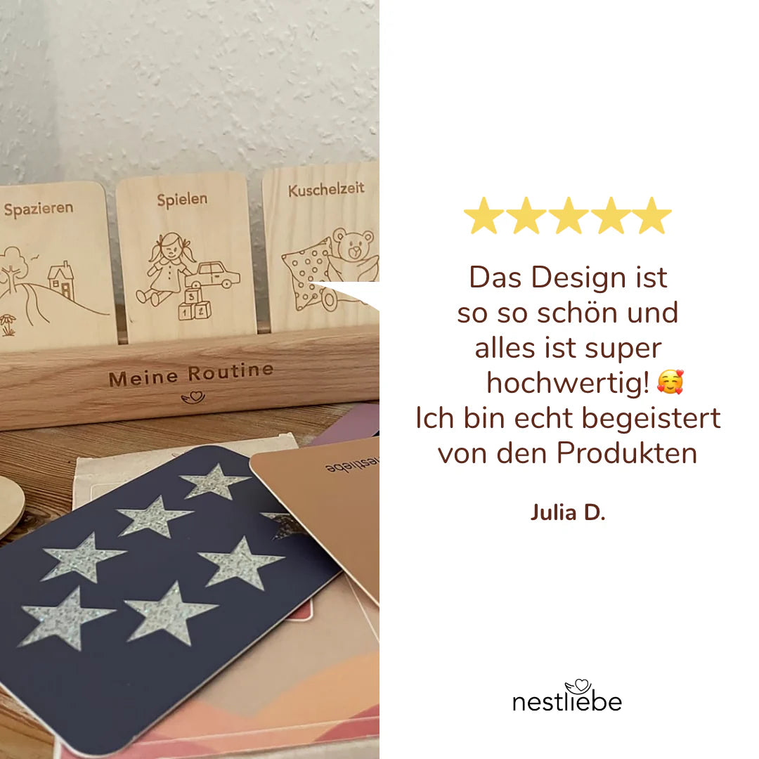 Somit wird das natürliche Bedürfnis nach Sicherheit mit den wiederkehrenden Routinen gestützt. Außerdem wird durch unsere liebevoll gestaltete Affirmationskarte das Selbstwertgefühl deines Kindes gestärkt.