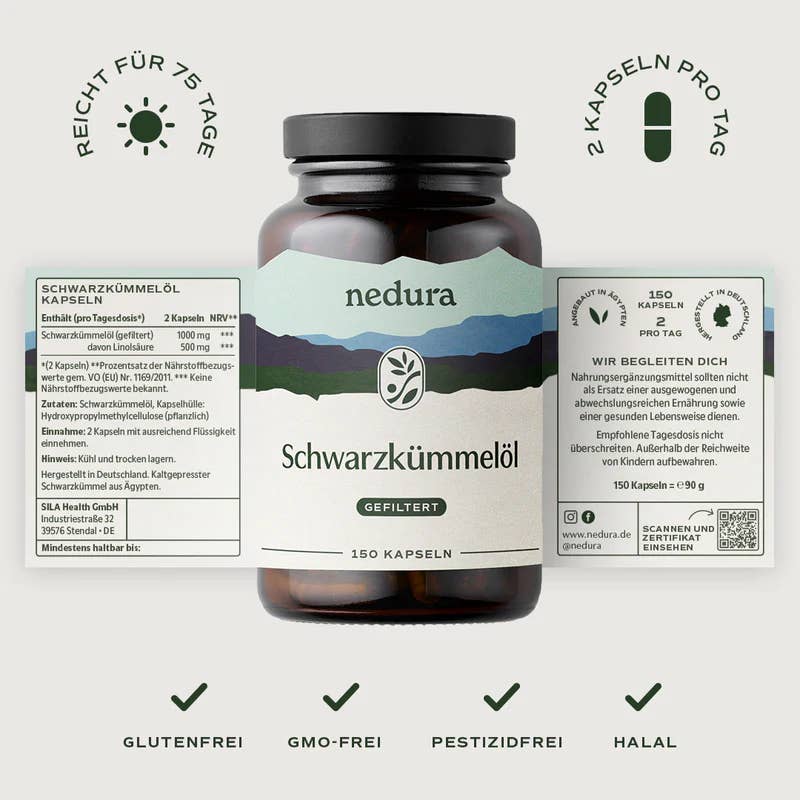 Hydroxypropylmethylcellulose (pflanzlich).Hergestellt in Deutschland. Kaltgepresster Schwarzkümmel aus Ägypten.